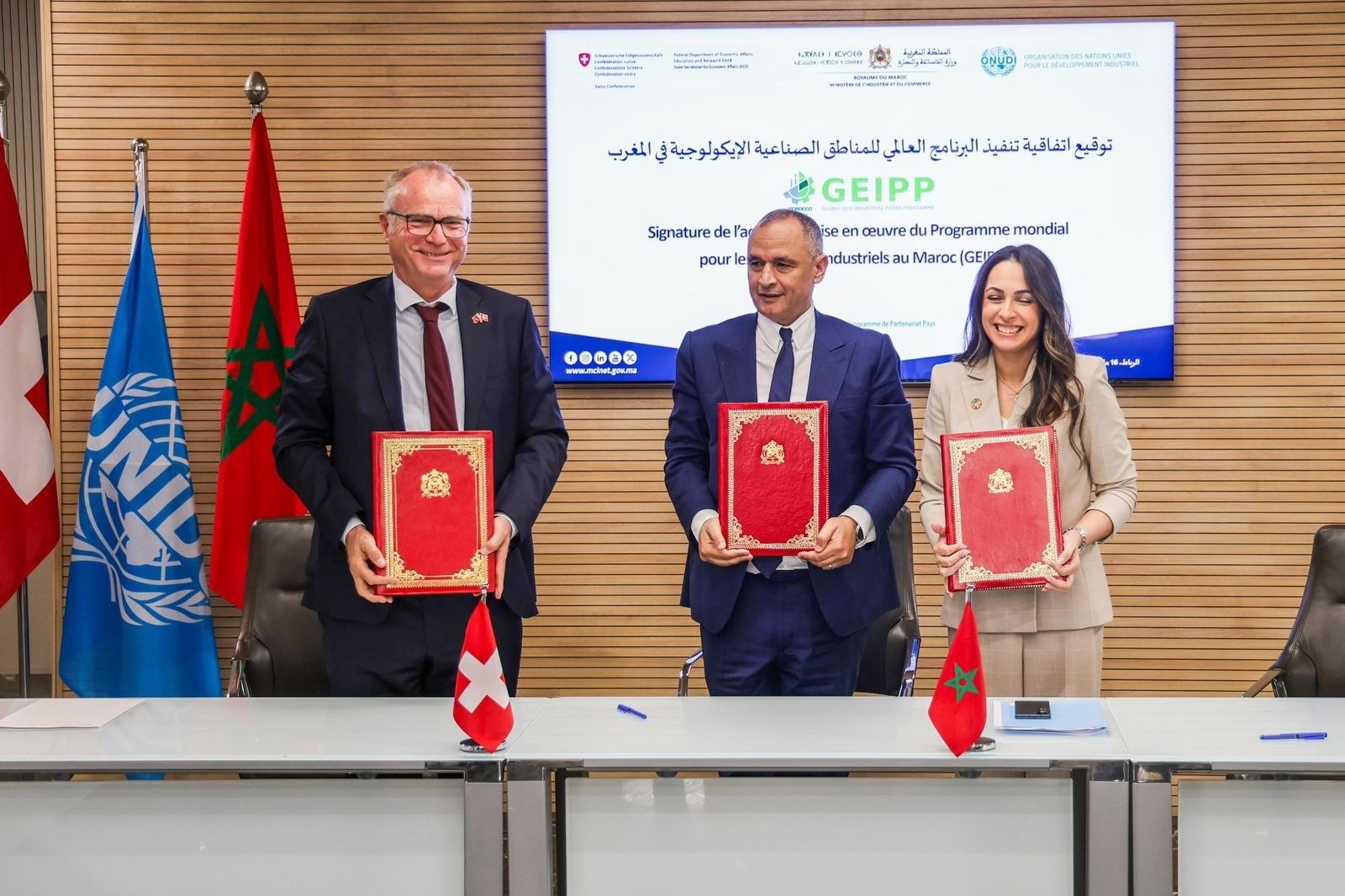 Un paso importante hacia una industria más sostenible se dio con la firma del Programa Global para Parques Ecoindustriales (GEIPP II) en Rabat. La ceremonia contó con la participación de S.E.M. Valentin Zellweger, Ryad Mezzour, Ministro de Industria y Comercio, y Sanae Lahlou, representante de la ONUDI en Marruecos.